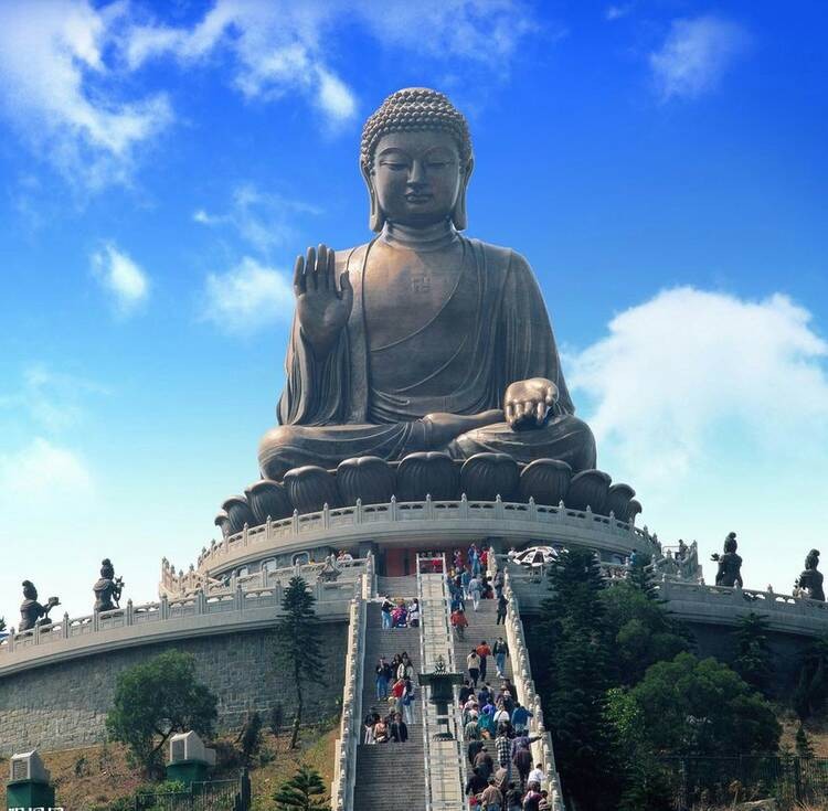 香港的天坛大佛,释迦牟尼座像,锡青铜材料,通高26.4米,重220吨,公元1993年建成。天坛大佛座落在香港大屿山海拔520米的昂平,是香港受欢迎的旅游景点之一。是全球最大的青铜座佛。佛像坐在268级的石阶上,端坐的佛像庄严肃穆,无论远观近看,都予人宁静祥和的感觉。美国权威地理旅游杂志《国家地理旅行者》极力推荐天坛大佛这项名胜。